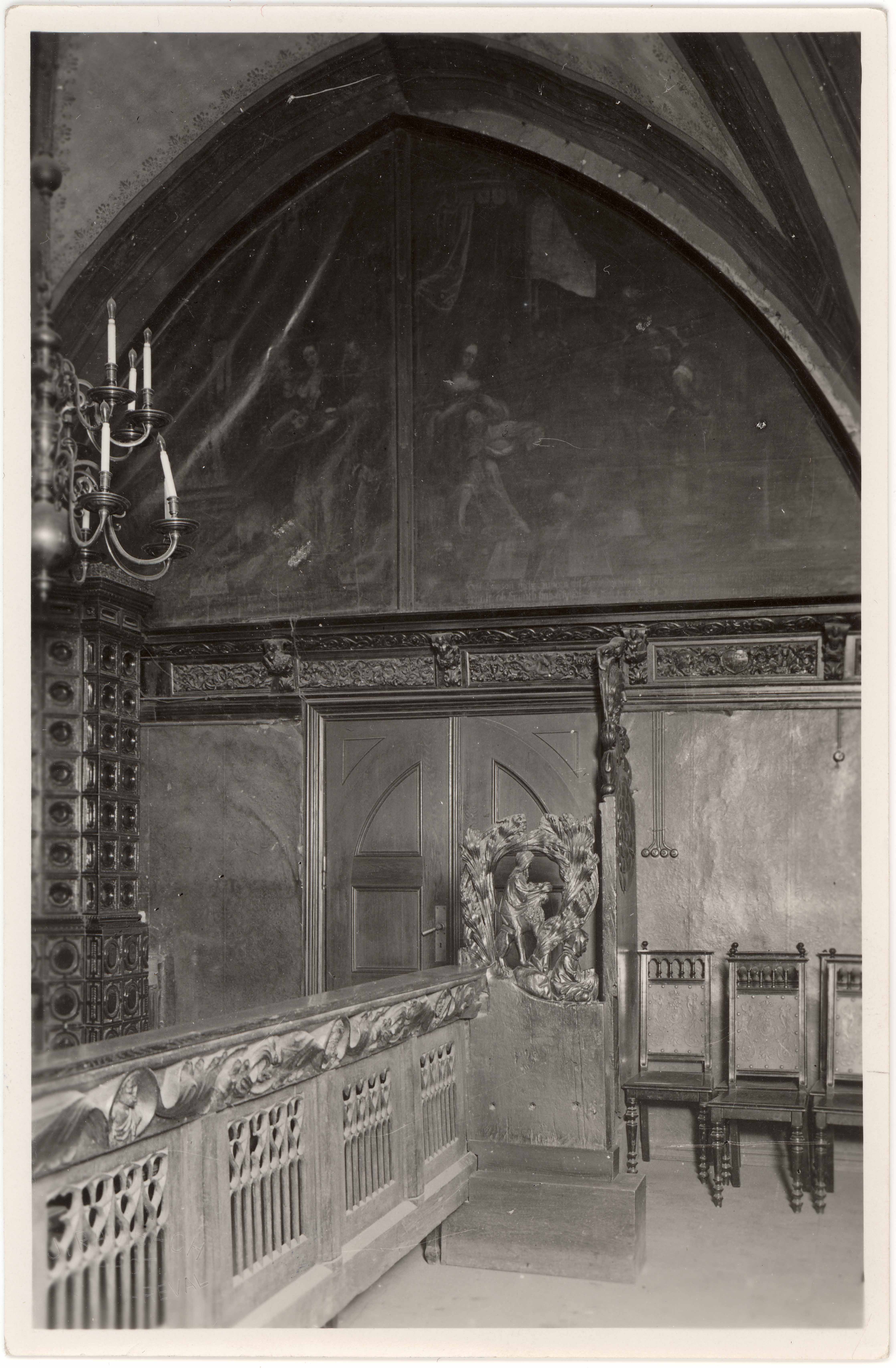 Tallinn. All-linn. Raekoja raesaal. Ees osa raepingist, keskel kaaruks, mille kohal maal (osa Saalomoni tsüklist), vasakul kahhelahi 17 saj /?/ (lammutatud)