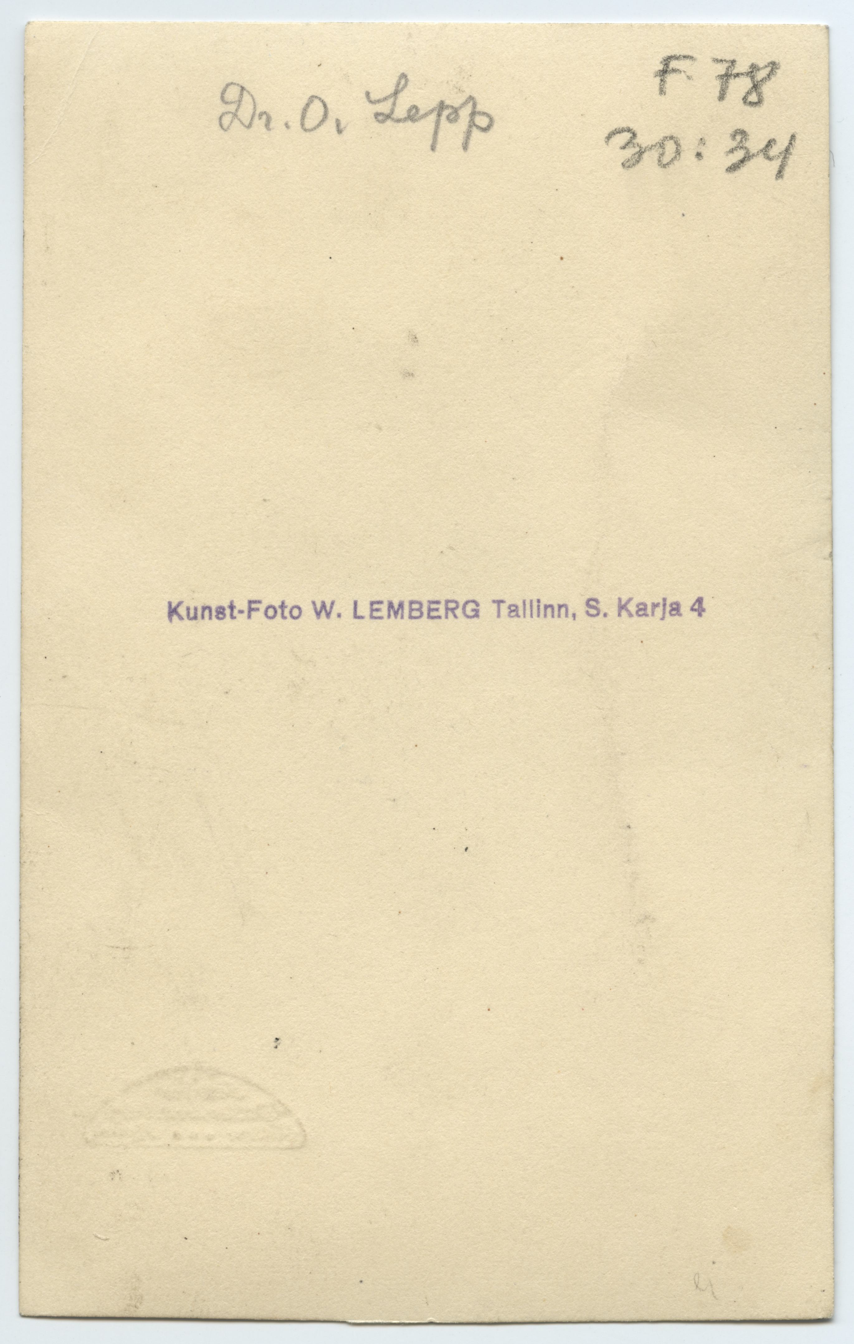 Foto pöördel Valter Lembergi fotoateljee tempel: Kunst-Foto W. LEMBERG Tallinn, S. Karja 4