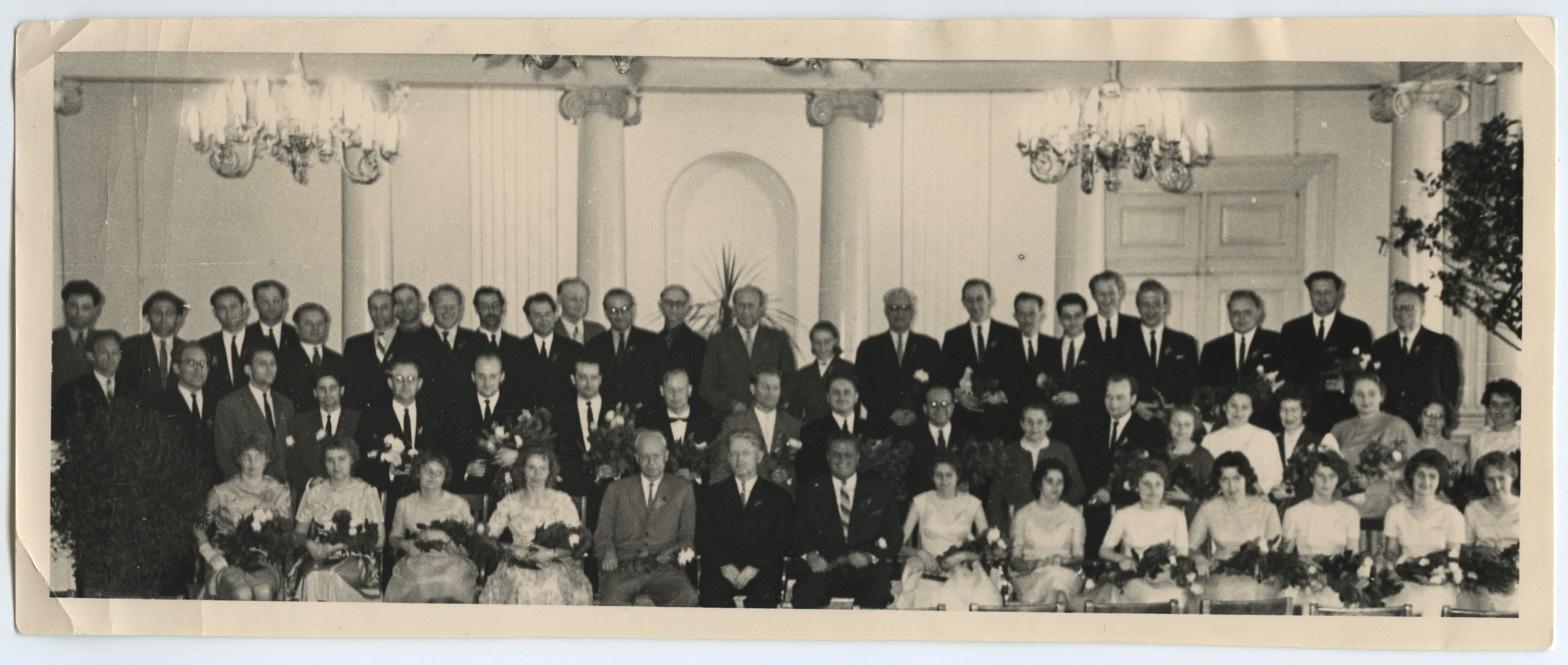 Tartu ülikooli õigus-majandusteaduskonna lõpetajad ülikooli aulas umbes 1960-ndate algul. Grupipilt