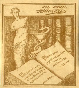Nelinurkses raamistuses esiplaanil avatud raamat, tagaplaanil Milo Veenus, karikas maoga ja raamatud. Joonises all vasakul signeering: АЖ. ülal paremal: ИЗЪ КНИГЪ / А. Живаго. all keskel avatud raamatus: Ut alimenta sanis / corporibus agricultura / [---];"Иваск