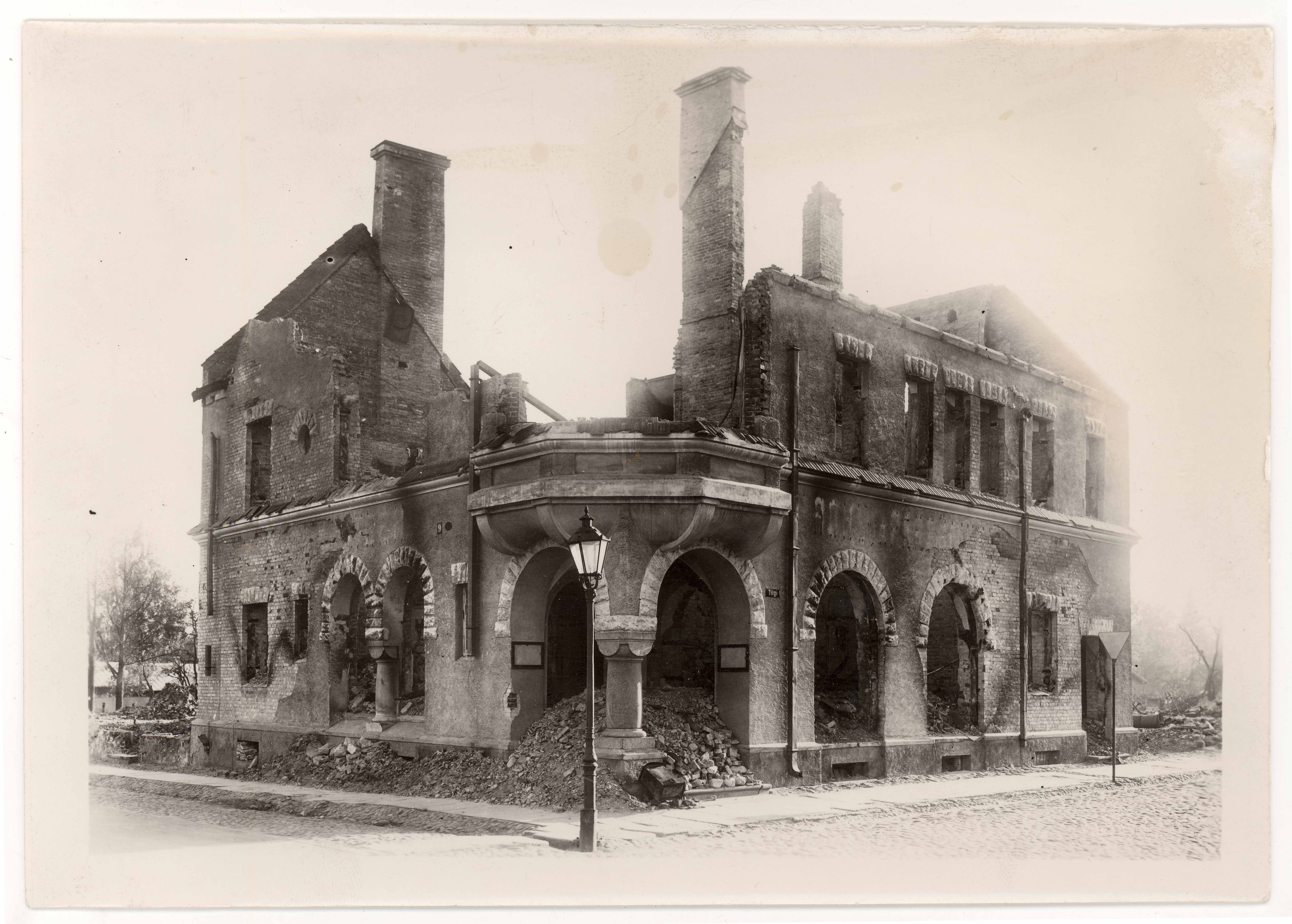 Tartu. Pepleri tn 9 (hävinud) W. Zeitleri Maarja apteek (Pepleri ja Tiigi tn nurgal, Maarja kiriku kooriruumi vastas). Vaade N-st pärast sõjapurustusi
