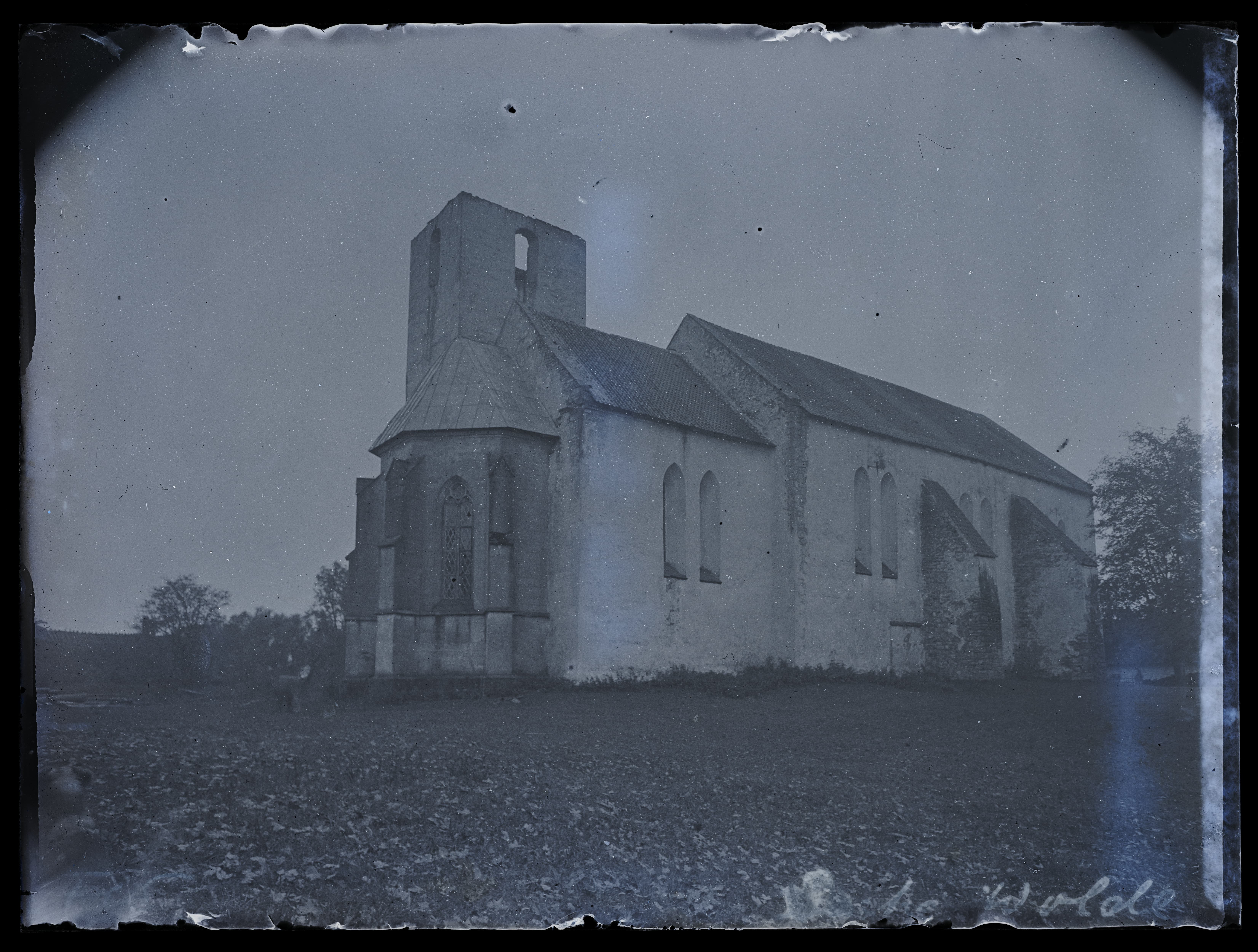 Vaade Valjala Martini kirikule NO-st. Kiriku tornil puudub katus (torn põlenud?)