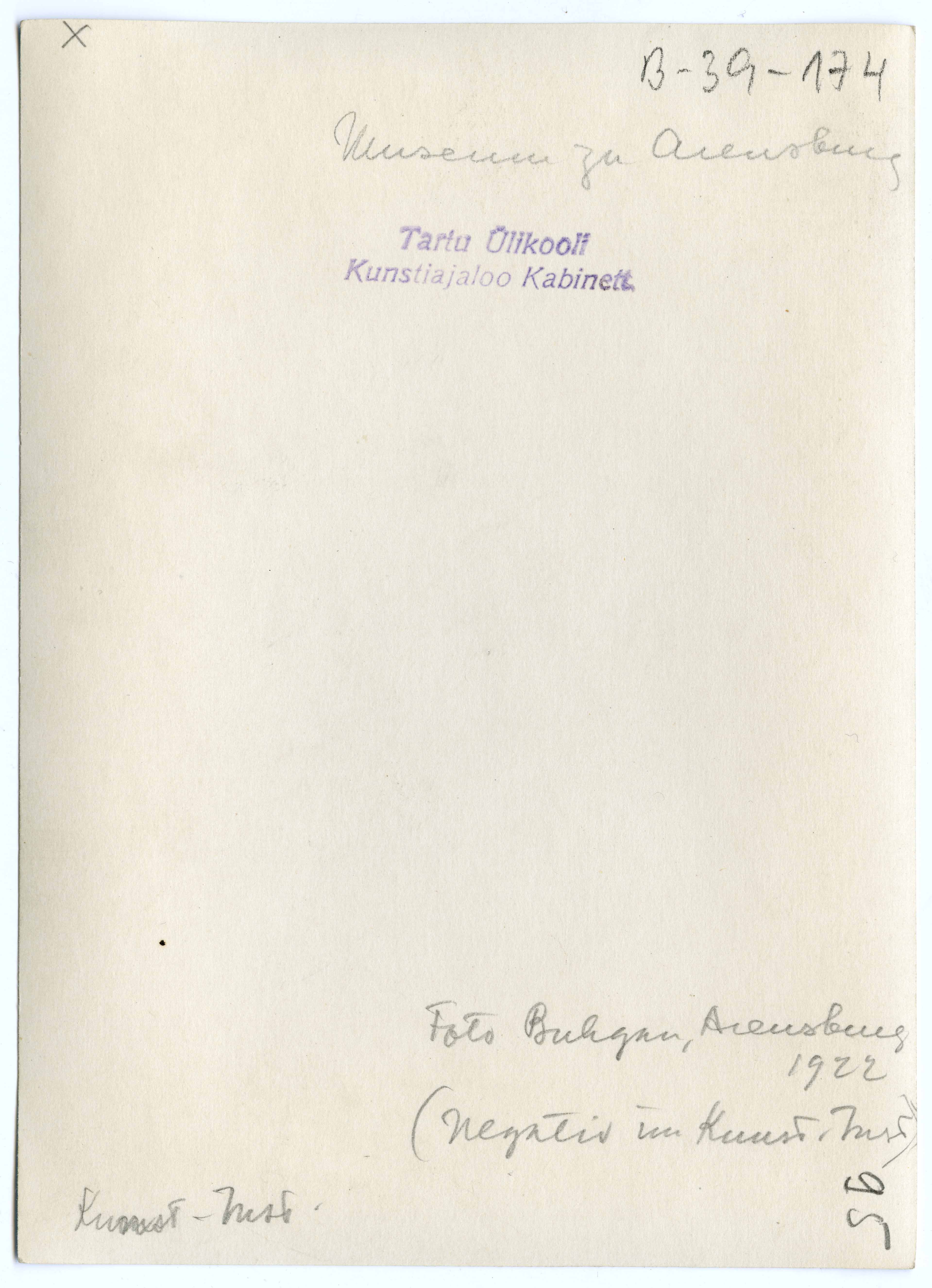 Tekst foto tagaküljel: Museum zu Arensburg. Foto Buhgan, Arensburg 1922 (negativ im Kunst Inst). Kunst. Inst. Tempel: Kabinett