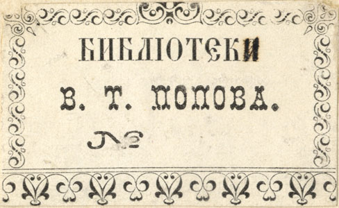 | dc.description | Nelinurkses ornamenteeritud raamistuses keskel: БИБЛIОТЕКИ / В.Т. ПОПОВА. / № | |