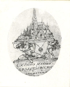 | dc.description | Ovaalis põlvitav mehefiguur ja puto toetamas linna maketti. Joonises all: EXLIBRIS SERGIUS / GRUSENBERG / ARCHITEKT | |