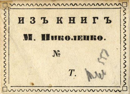 Nelinurkses ornamenteeritud raamistuses: ИЗЪ КНИГЪ / М. Николенко. / № / Т.;