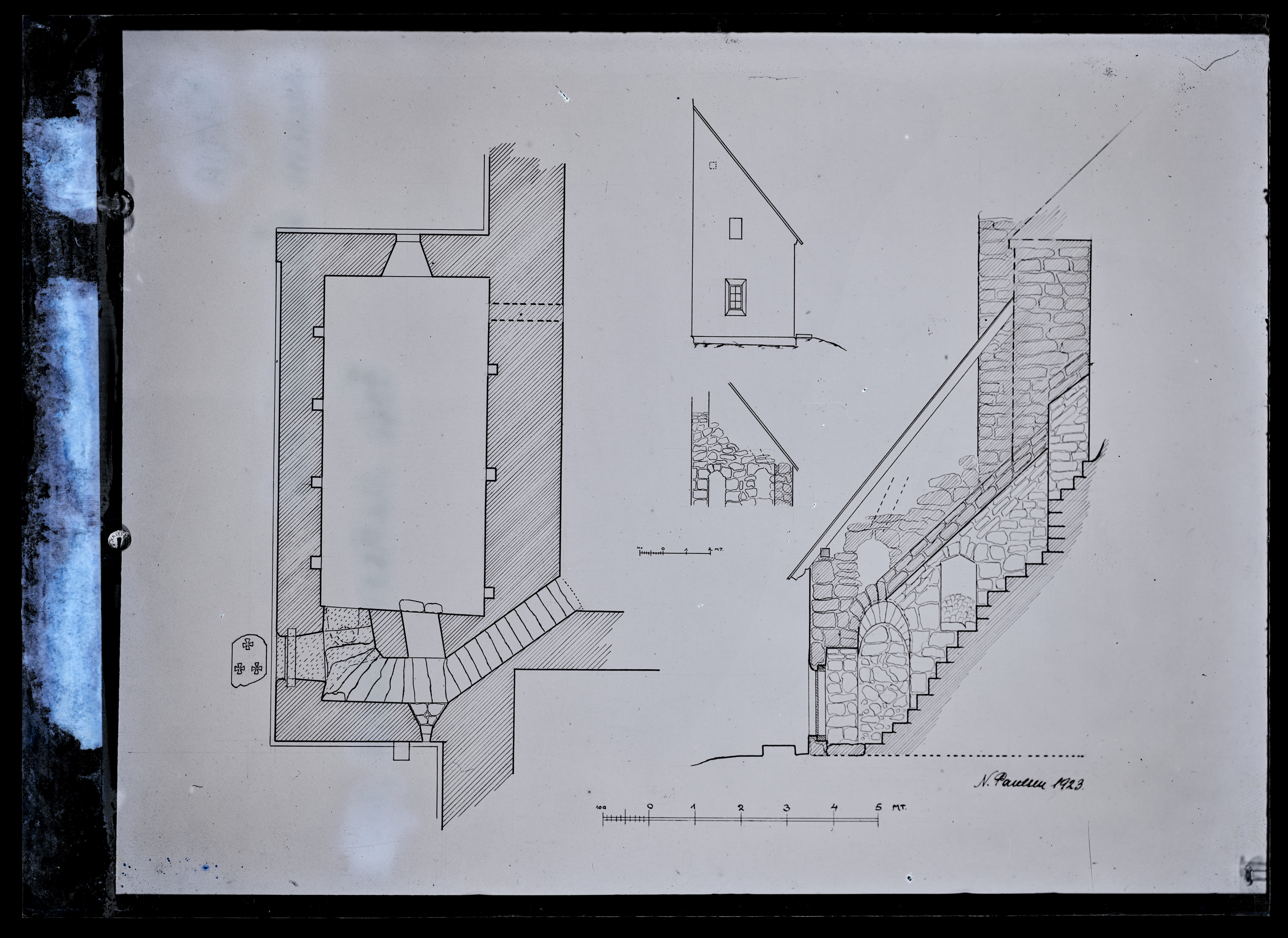 Karja Katariina ja Nikolause kirik. Käärkambri-pealse ruumi põhiplaan, välisvaade ja trepi pikilõige. Koostanud N. Paulsen 1923.a.