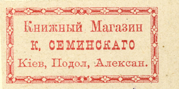 Nelinurkses ornamenteeritud raamistuses: Книжный Магазин / К. СЕМИНСКАГО / Кiев, Подол, Алексан.