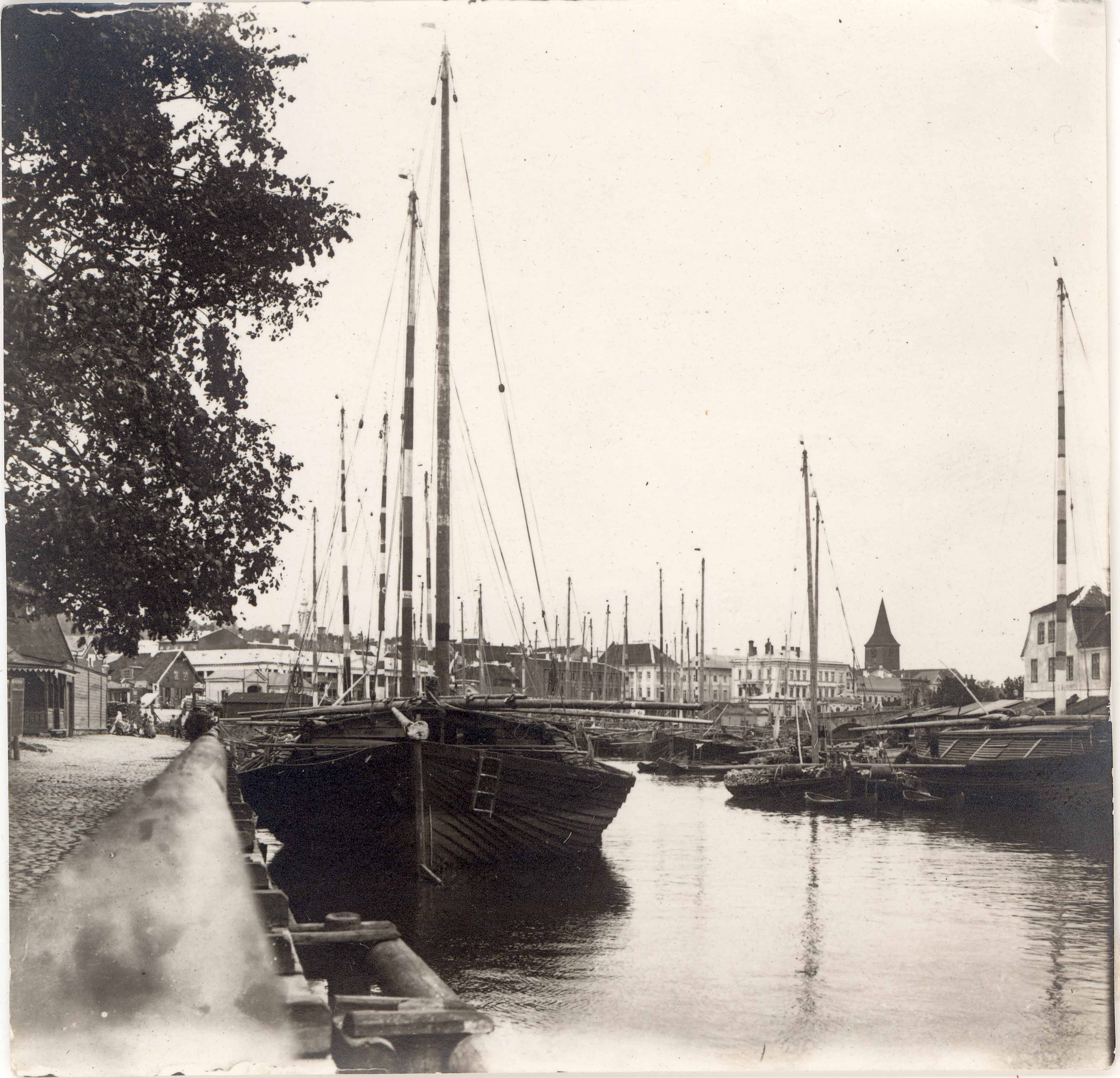 Tartu. Puulodjad Emajõe ääres. Vaade Emajõe kaldalt Söögituru poole NW suunas. Tagaplaanil Jaani kiriku torn.