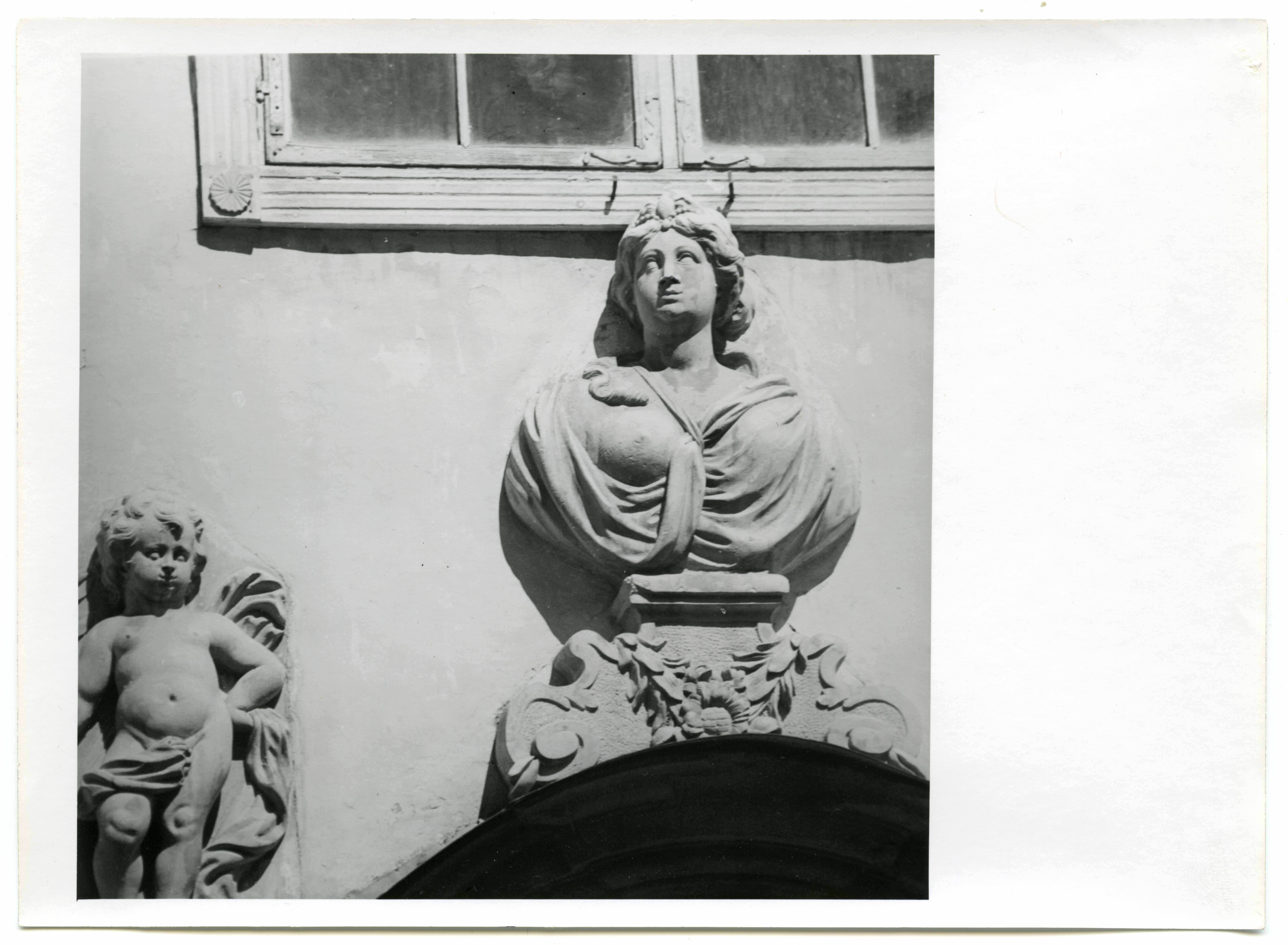 Narva. Rüütli tn 24, Hermann Poorteni maja portaali ülaosa detail: naise büst ja vasakpoolne puto. J. van der Capelle, 1695