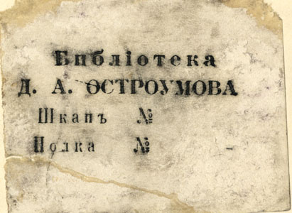 Lehel tempel: Библiотека / Д. А. ОСТРОУМОВА. / Шкапъ № / Полка №