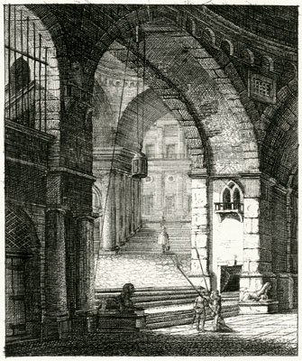 [Võlvitud hoone interjöör astanguga]