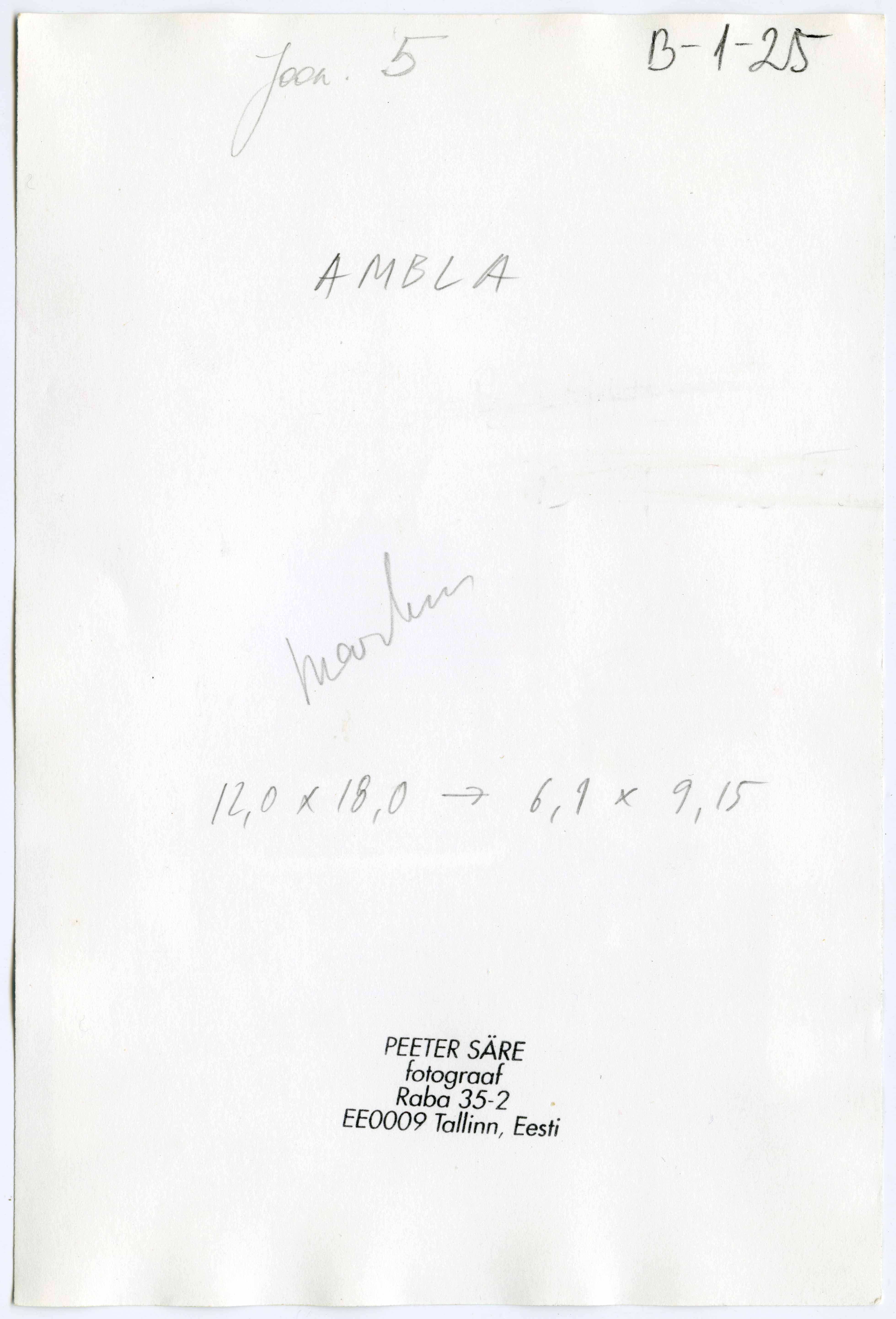 | dc.description | Tekst foto tagaküljel: Joon. 5. AMBLA. Markus. 12,0x18,0->6,1x9,15. Tempel: Peeter Säre | et |