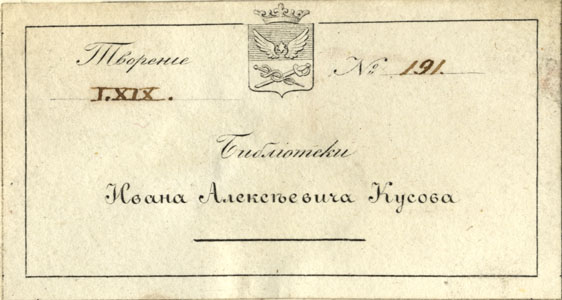 Nelinurkses raamistuses ülal keskel vapp, vapikilbil ülal tiivad ja täht, all ristatud mõõk ja heeroldikepp. Joonises keskel: Библioтeки / Ивана Алексѣевича Кусова ülal vasakul: Творенiе paremal: №