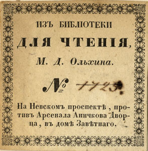 Nelinurkses ornamenteeritud raamistuses: ИЗЪ БИБЛIОТЕКИ / ДЛЯ ЧТЕНIЯ, / М.Д. Ольхина. / № / На Невскомъ проспектѣ, про- / тивъ Арсенала [---]