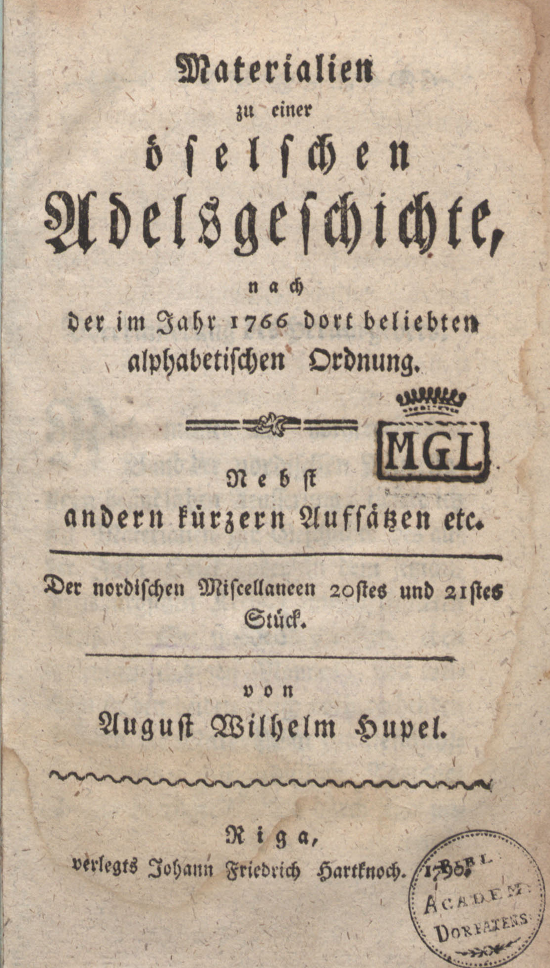 | dc.title.alternative | Materialien zu einer öselschen Adelsgeschichte, nach der im Jahr 1766 dort beliebten alphabetischen Ordnung | |