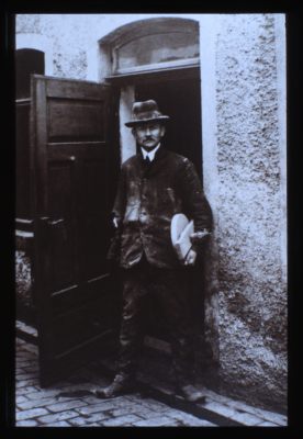 Schmidt, Bernhard. Väljumas töökojast Mittweidas. Täisfiguurportree