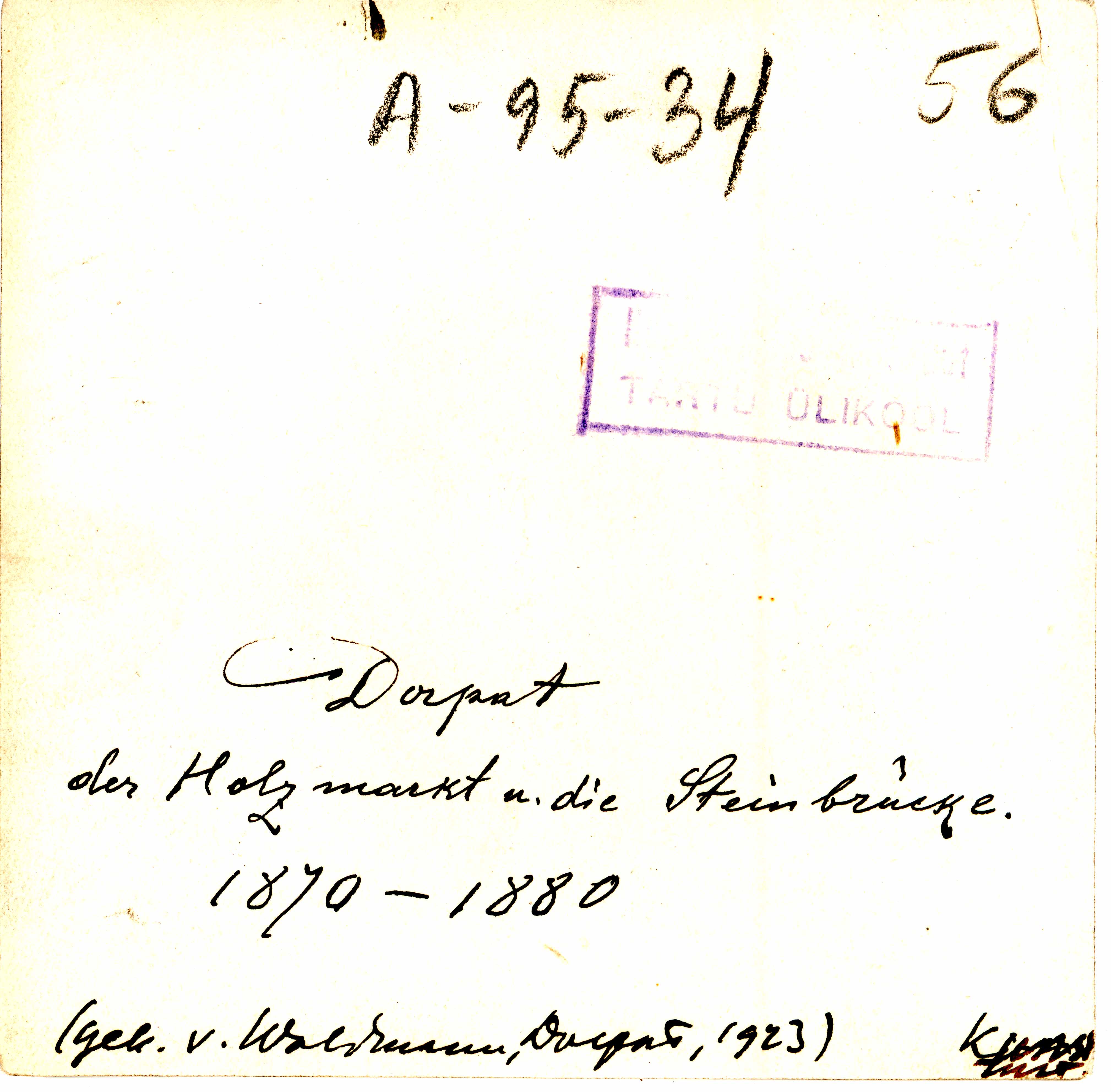 Tekst foto tagaküljel: Dorpat. Der Holzmarkt u die Steinbrücke. 1870-1880. (gek v Waldmann, Dorpat, 1923) Kunst. Inst. Tempel: Instituut