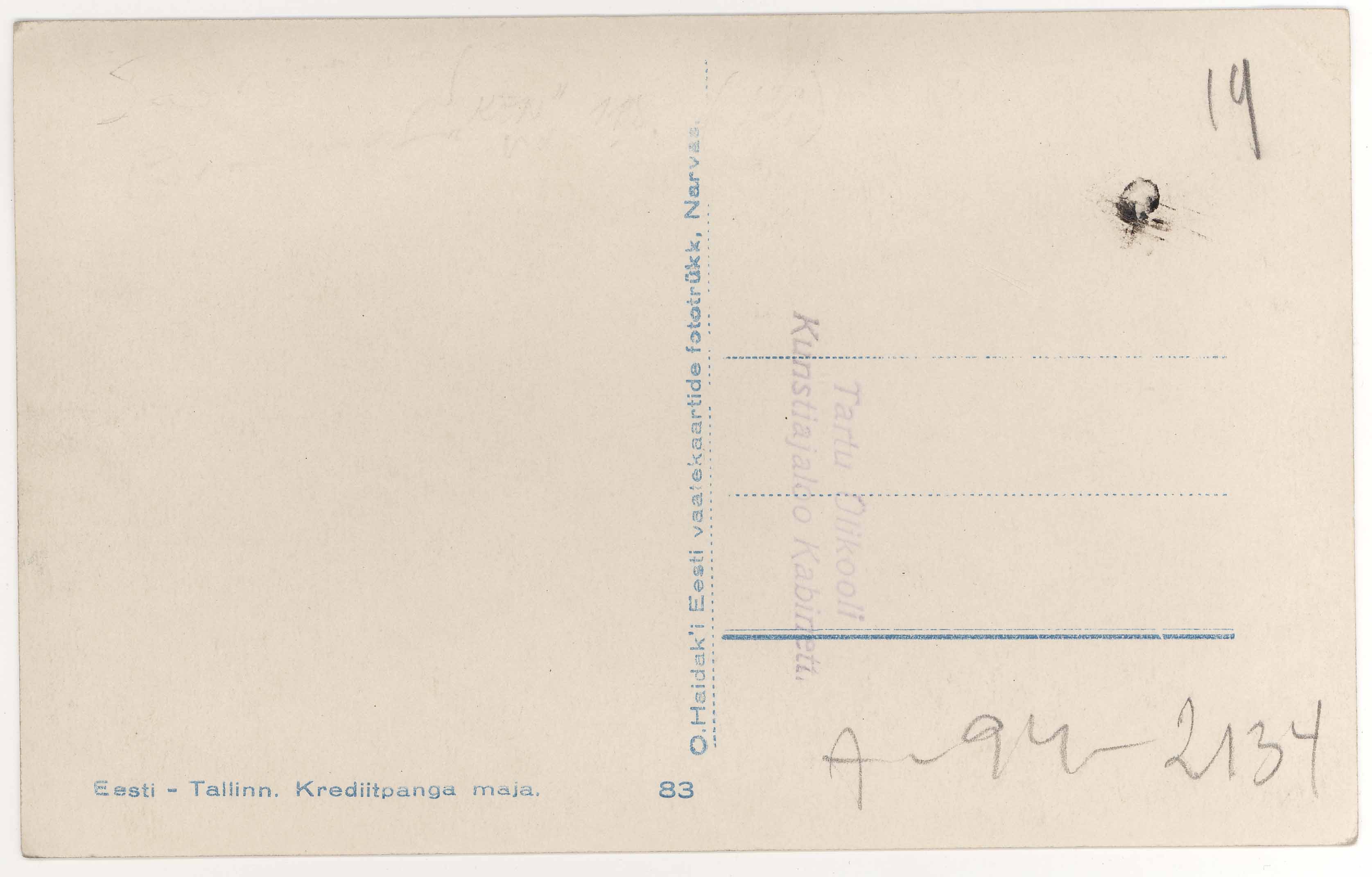 | dc.description | Tekst foto tagaküljel: Eesti - Tallinn. Krediitpanga maja. Tempel: Kabinett | et |