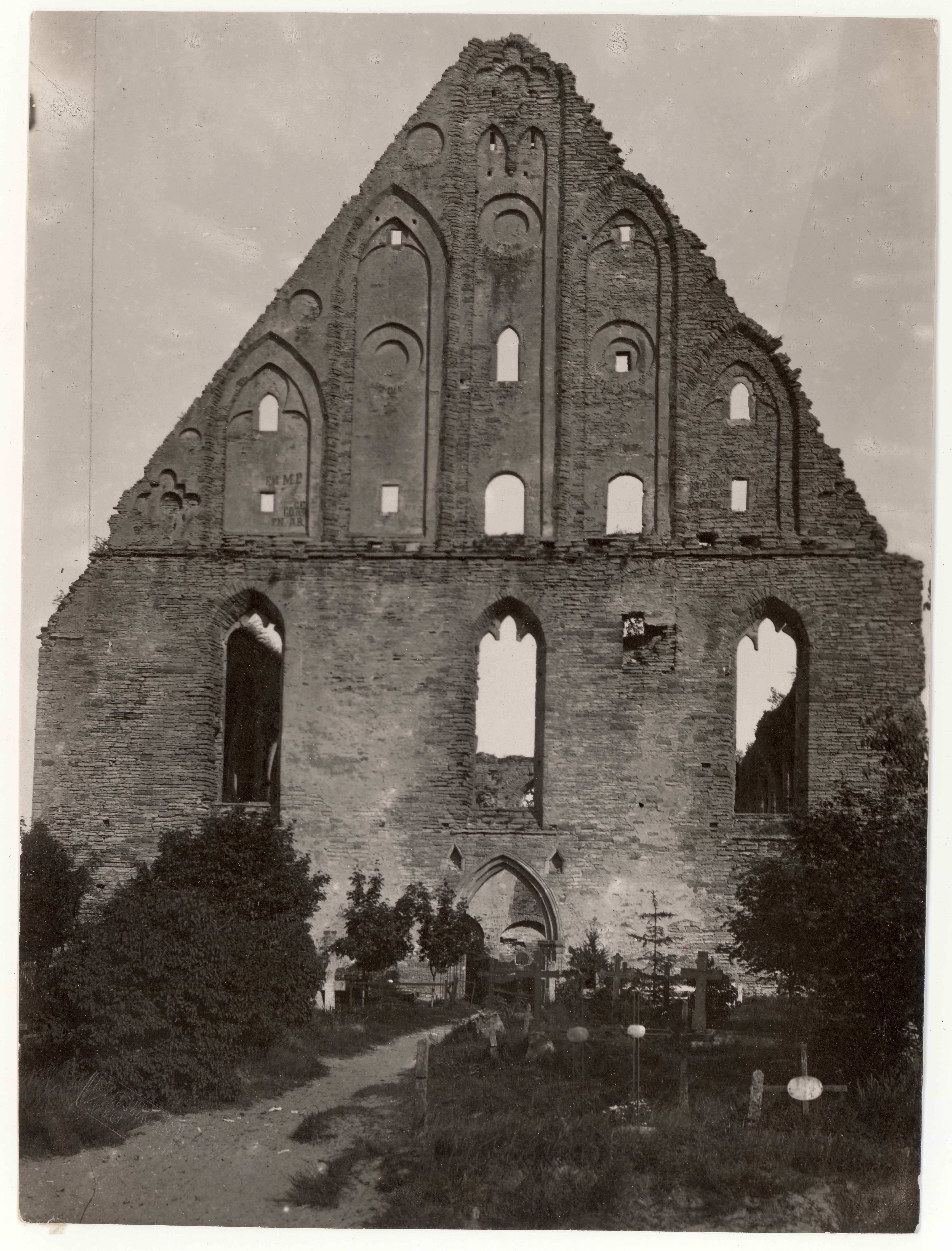 Pirita kloostrikiriku viiluga läänefassaad ja kalmistu. Lääneviil konserveerimata