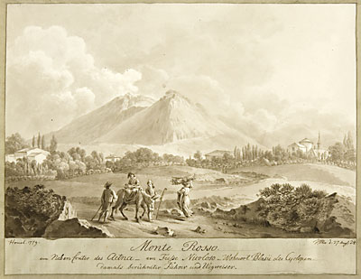 Itaalia, Sitsiilia, Etna vulkaan, kohavaated, maastikud, baltisaksa, kunst, joonistus, seepia (kunst), 19. saj., 1820-ndad