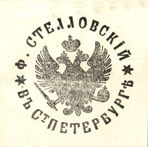 Vapp kahepäise kotkaga. Joonises sõõrijal ümber vapi: Ф. СТЕЛЛОВСКİЙ ВЪ Ст-ПЕТЕРБУРГѢ
