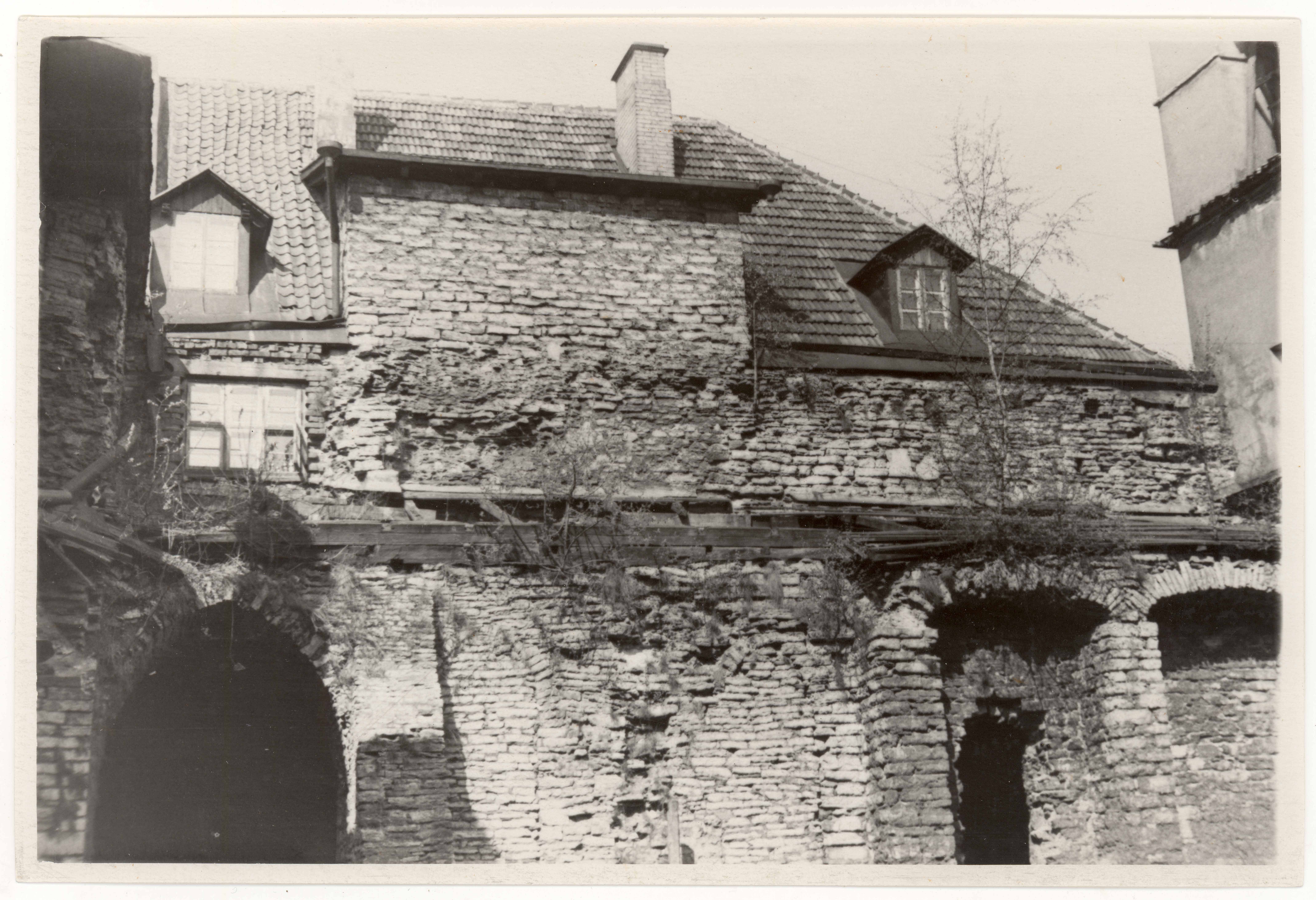 Tallinn. All-linn. Dominiiklaste kloostri lääneristikäigu kloostriõue poolne O-sein. Vaade O-st seina S-poolse osa ülaosale ja uue dormitooriumi katusele