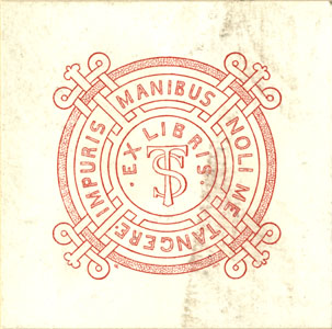 Ringidest ja ristidest koosnev põimitud ornament, mille keskel monogramm TS, ümber ringis tekst: IMPURIS MANIBUS NOLI ME TANGERE keskel ringis ülal: EX LIBRIS all vasakul signeering all paremal dateering: 1919