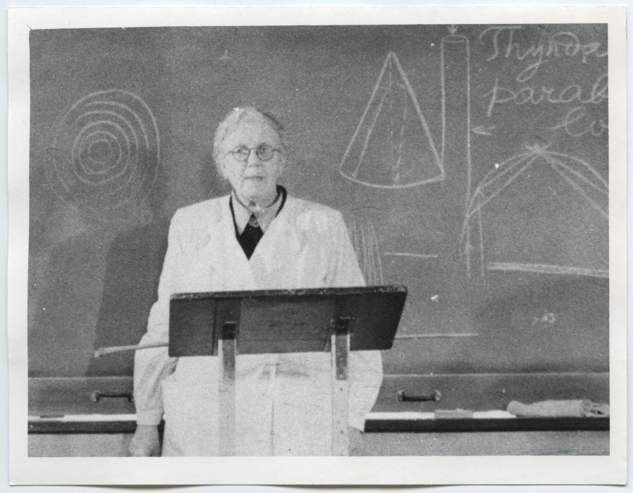 Poska-Teiss, Lydia. Tahvli juures loengut pidamas