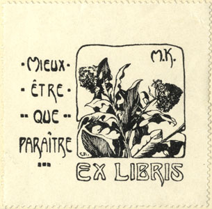 Nelinurkses raamistuses õitsvad taimed. Joonises all signeering: С.Л. ülal paremal monogramm: M.K. all: EX LIBRIS vasakul: *MIEUX* / *ÊTRE* / **QUE** / PARAÎTRE / ***