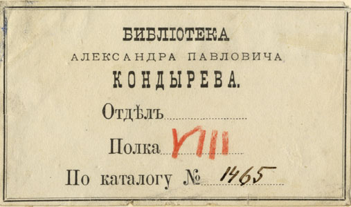 | dc.description | Nelinurkses mustas raamistuses: БИБЛIОТЕКА / АЛЕКСАНДРА ПАВЛОВИЧА / КОНДЫРЕВА. / Отдѣлъ / Полка / По каталогу № | |