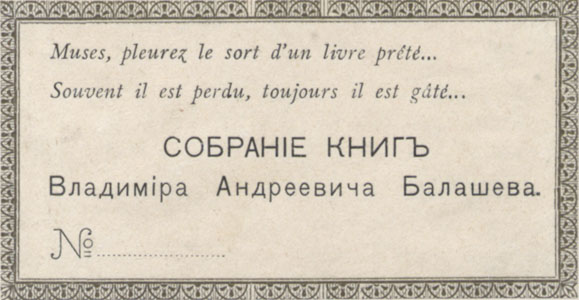 | dc.description | Nelinurkses ornamenteeritud raamistuses keskel: СОБРАНIЕ КНИГЪ / Владимiра Андреевича Балашева. / № ... ülal: Muses, pleurez le sort d'un livre prêtè... / Souvent il est perdu, toujours il est gâtè... | |