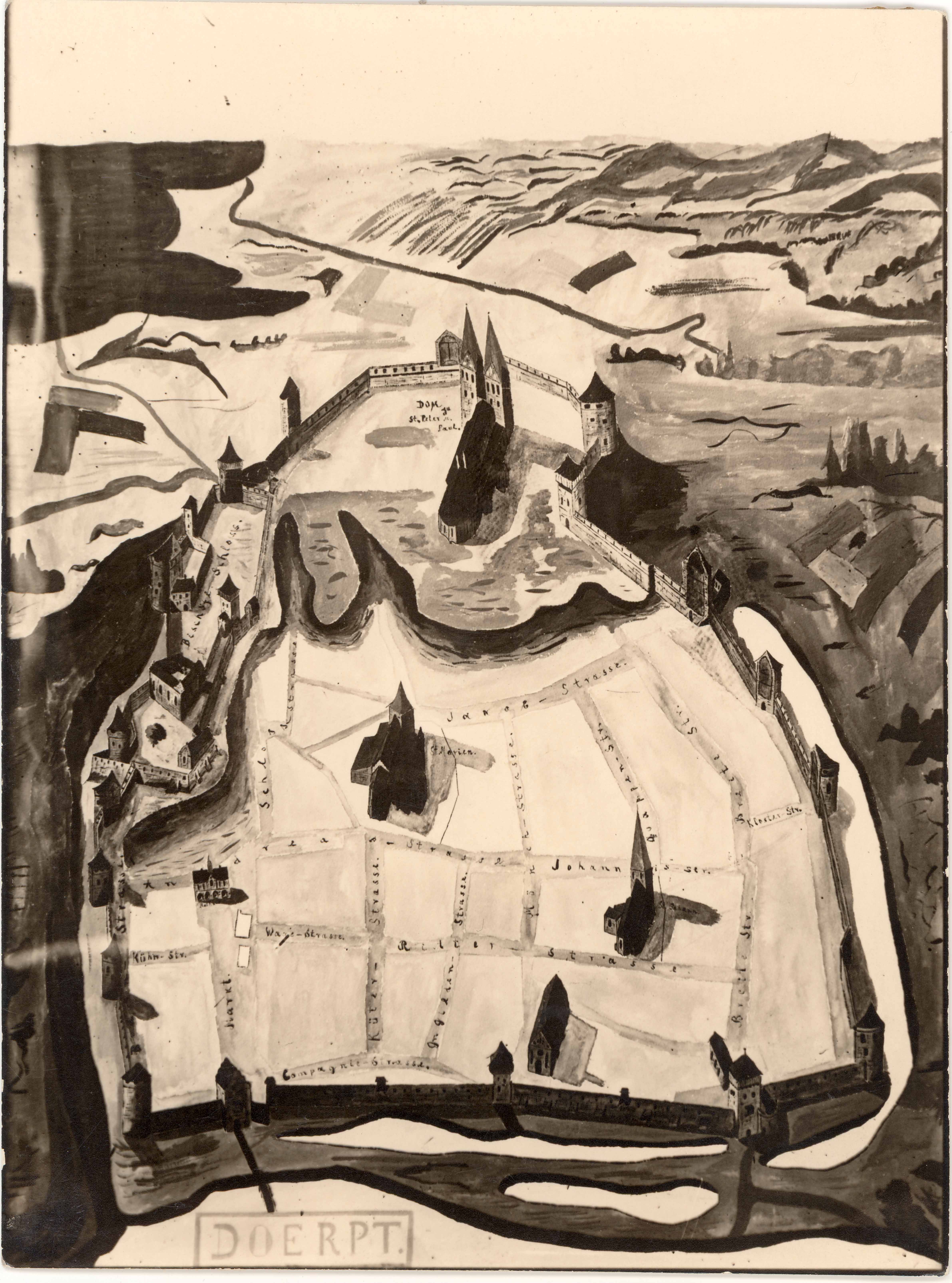 Keskaegse Tartu plaan kindlustuste (linnamüüri ja tornide), linnuse, kirikute ja raekoja kolmemõõtmeliste joonistustega. Snääli akvarell Richard Otto plaanide järgi