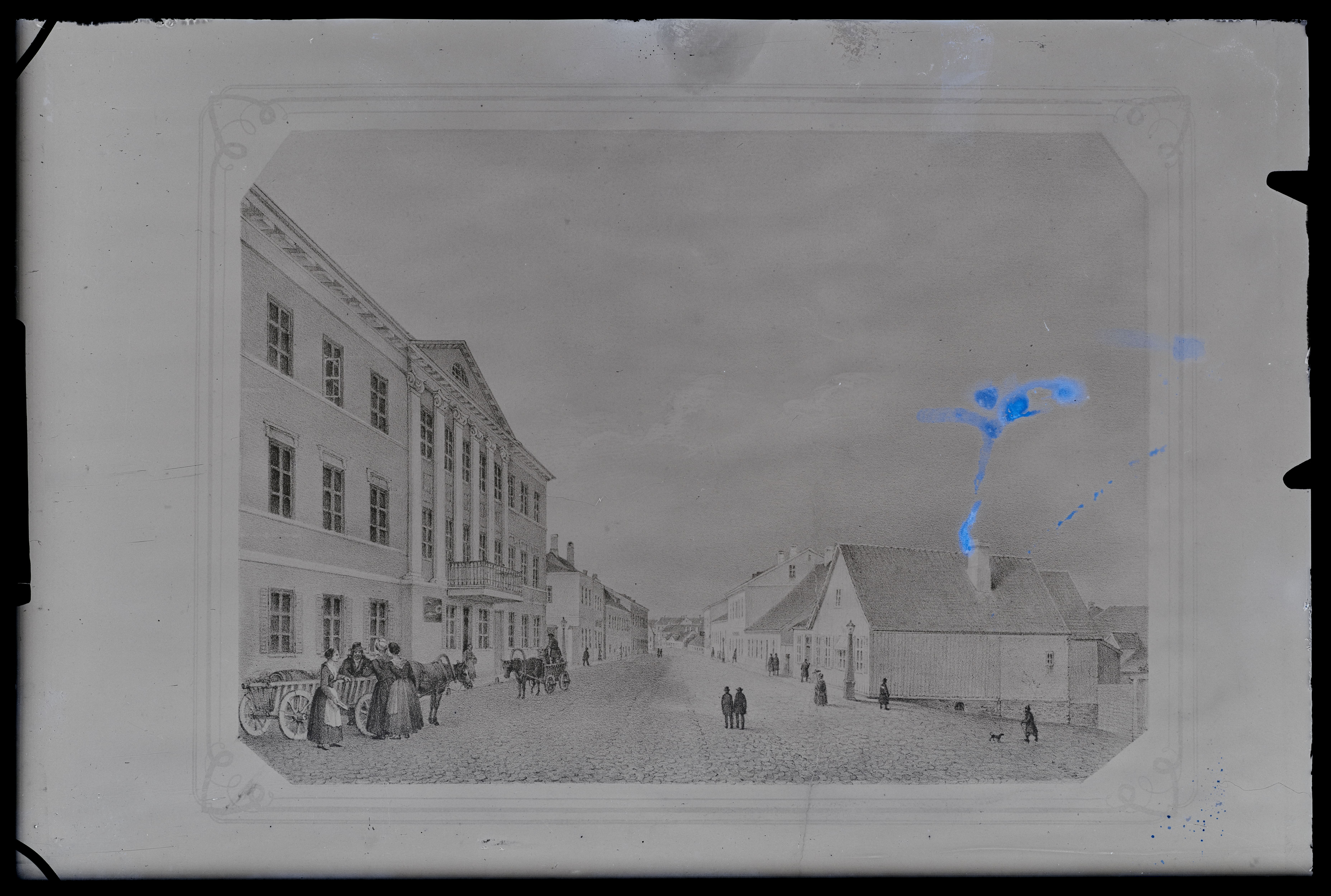 Tekst negatiivi ümbrikul: Schlater. Riia t. Malerische D. 5. Ansicht von der Kreisschule zu Dorpat. Vaade Kreiskooli kohalt (Riia, Karlova ja Aia tn ristumise kohalt) kesklinnale Promenaadi tn suunas. Esiplaanil piimamees ja 3 naist