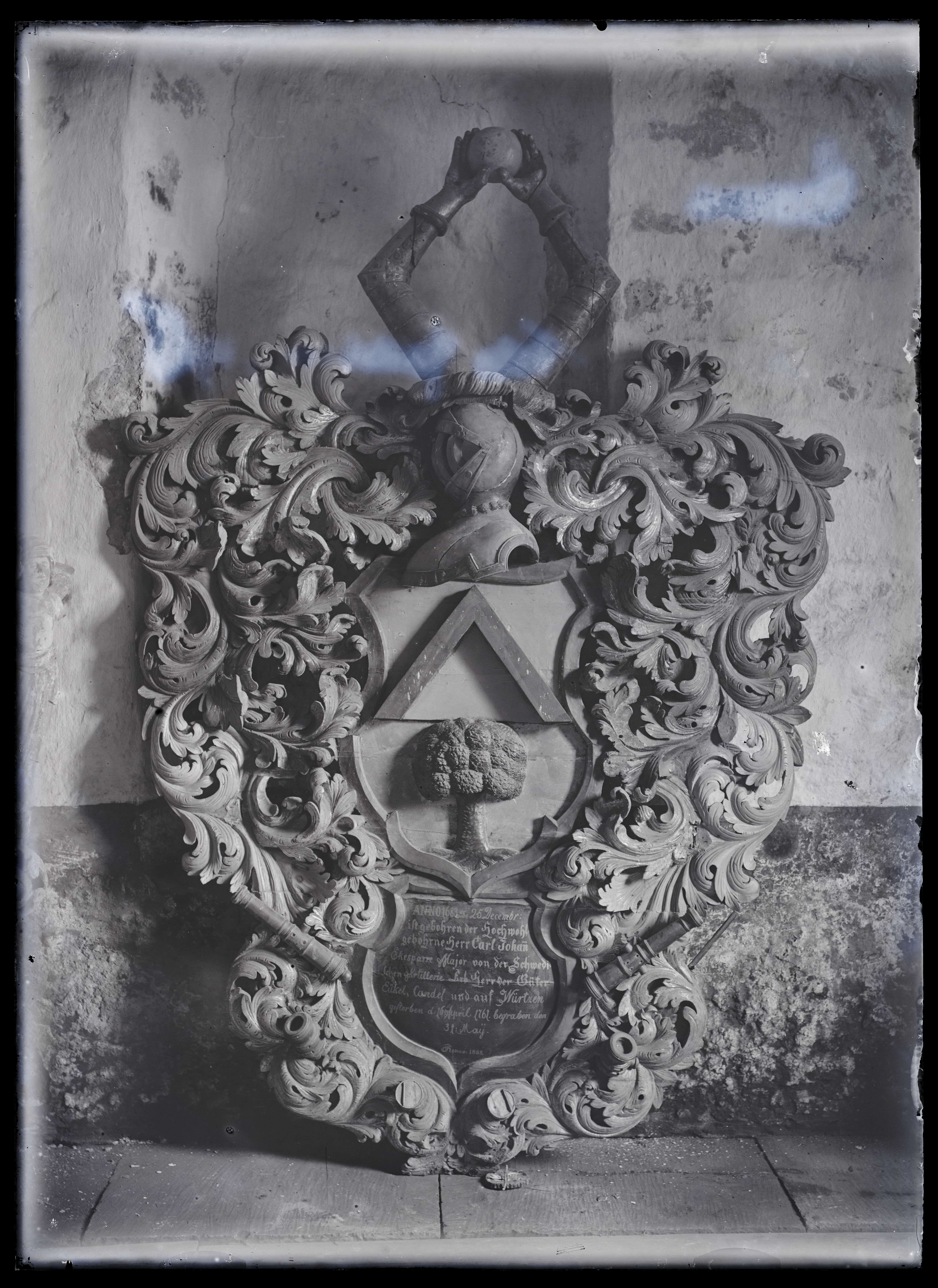 Kaarma Peetri ja Pauli kirik. Eikla mõisa omaniku ja endise Rootsi majori Carl Johann Ekesparre (1683-1761) vappepitaaf. Gottfried Böhme. 1760ndate algus.