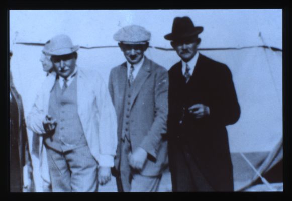 Richard Schorr, Walter Baade, Bernhard Schmidt päikesevarjutuse ekspeditsioonil Põhja-Rootsis Jokkmokkis. Grupipilt