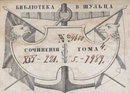 | dc.description | Ristatud lippude ja ankru taustal kahe kotkapeaga raamistus. Plaadil ülal: БИБЛIОТЕКА В. ШУЛЬЦА joonises keskel: № / СОЧИНЕНIЯ ТОМА | |
