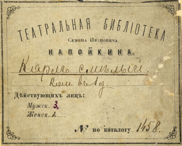 Nelinurkses raamistuses ülal keskel: ТЕАТРАЛЬНАЯ БИБЛIОТЕКА / Семена Ивановича / НАПОЙКИНА. all vasakul: Дѣйствующихъ лицъ: / Мужск. / Женск. all paremal: № по каталогу