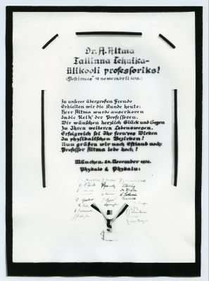 Õnnitlused Müncheni kolleegidelt Albrecht Altma valimise puhul Tallinna Tehnikaülikooli professoriks 1938. a.