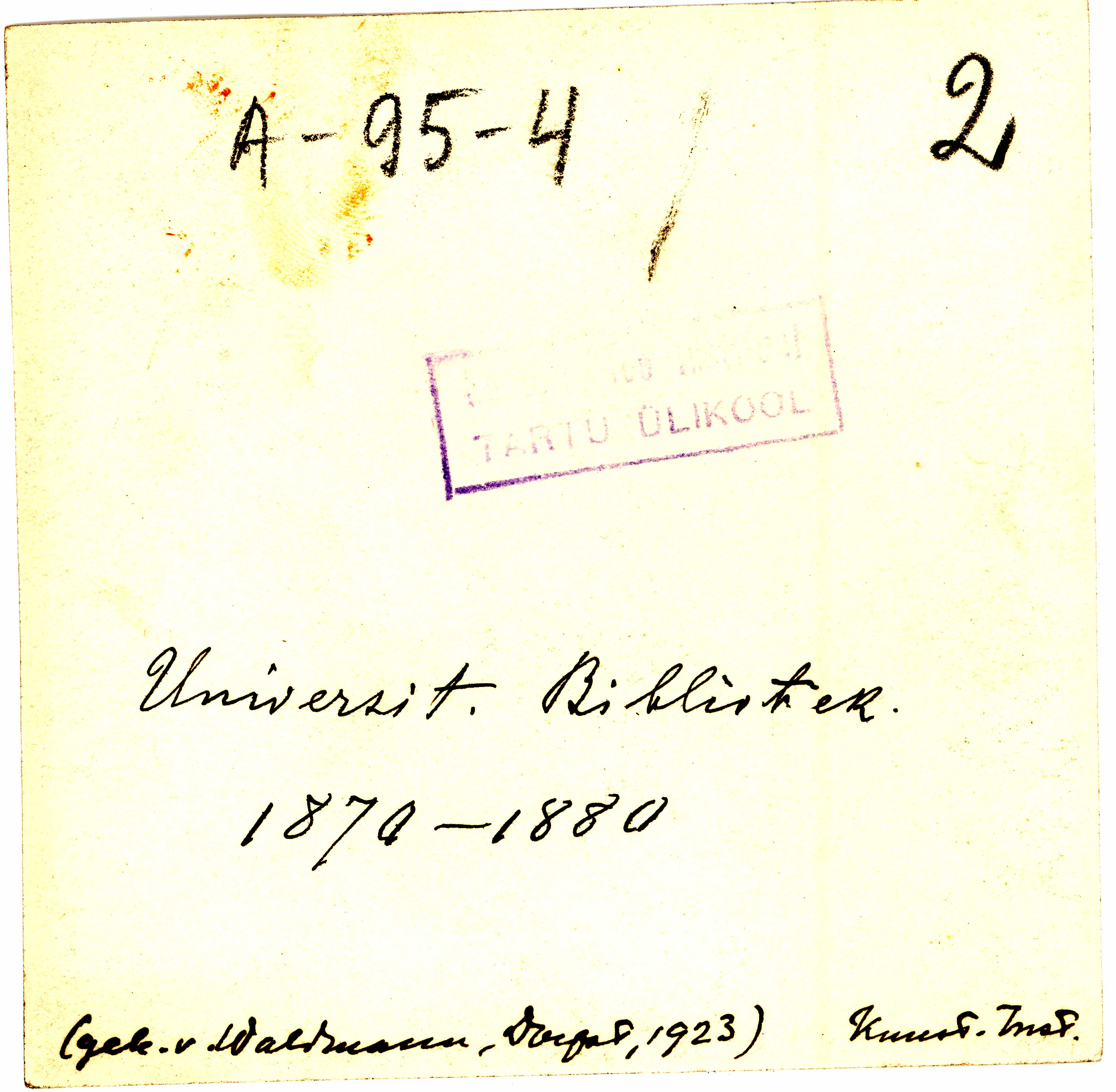 Tekst foto tagaküljel: Universit. Bibliotek. 1870-1880. (gek v Waldmann, Dorpat, 1923) Kunst. Inst. Tempel: Instituut