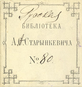 Nelinurkne ornamenteeritud raamistus. Joonises keskel: БИБЛIОТЕКА / А. С. СТАРЫНКЕВИЧА / №