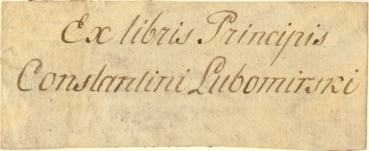 | dc.description | Lehel käsitsi kirjutatud tekst: Ex libris Principis / Constantini Lubomirski | |