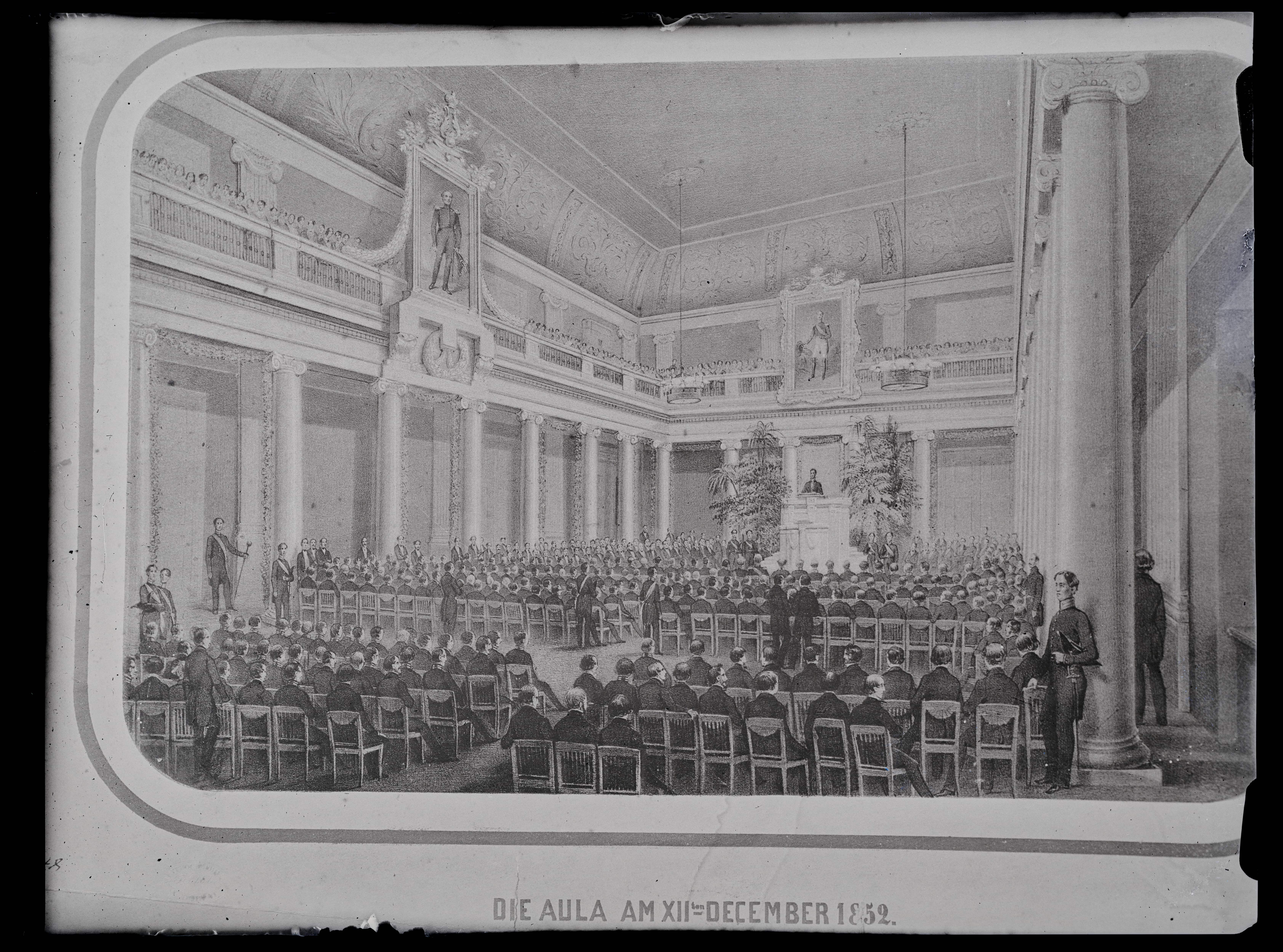 Tekst negatiivi ümbrikul: Pärnu muuseum. Schlater: Die Aula am XII ten. December 1852. Foto Tuulse, 1943. Tempel: Instituut