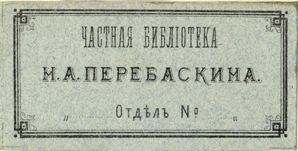 Nelinurkses ornamenteeritud raamistuses: ЧАСТНАЯ БИБЛIОТЕКА / Н. А. ПЕРЕБАСКИНА. / Отдѣлъ №