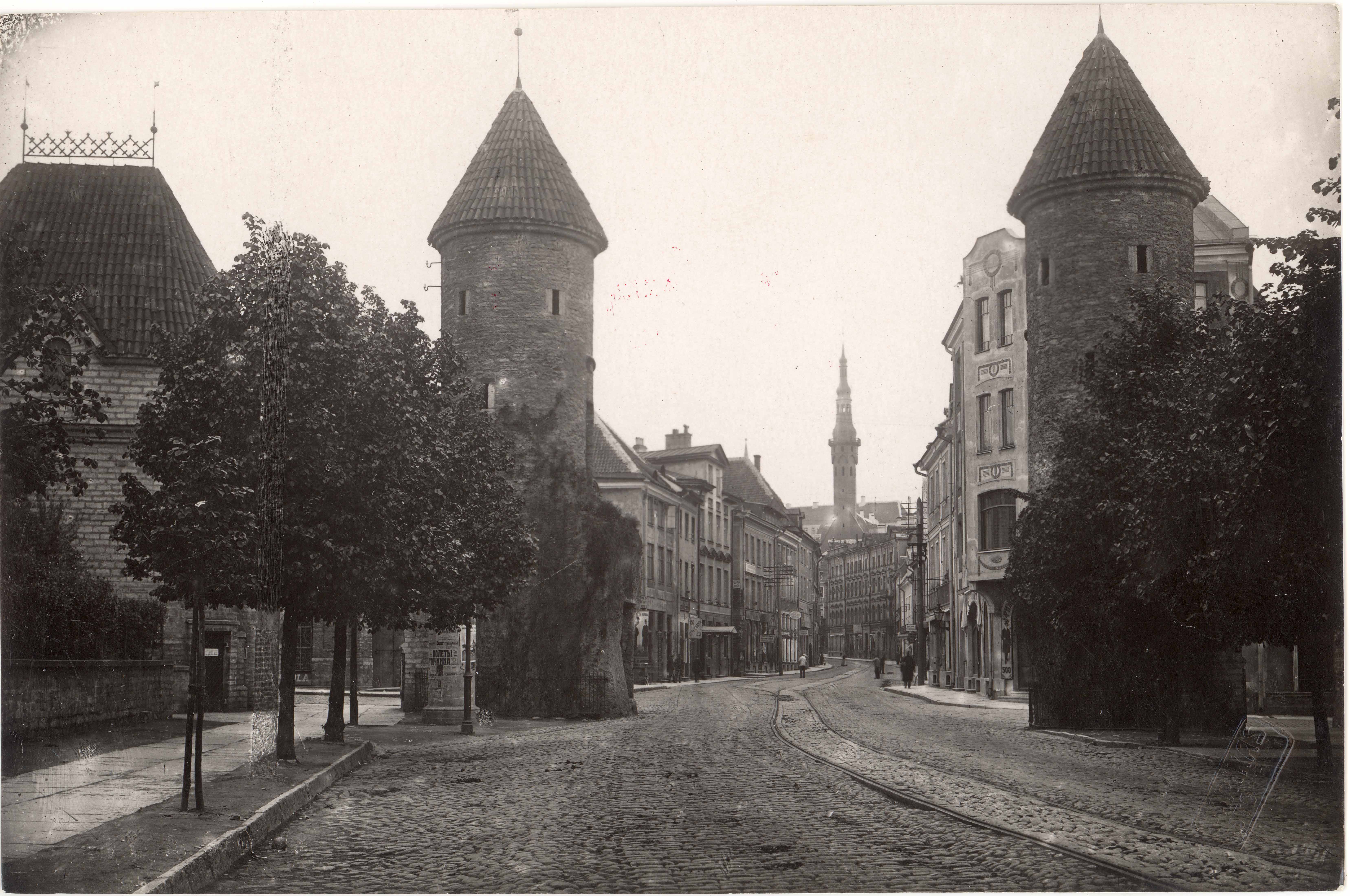 Tallinn. All-linn. Vaade O-st Viru värava eesvärava tornidele ja Viru tänavale. Tagaplaanil raekoja torn. Raudteerööpad Viru tänaval