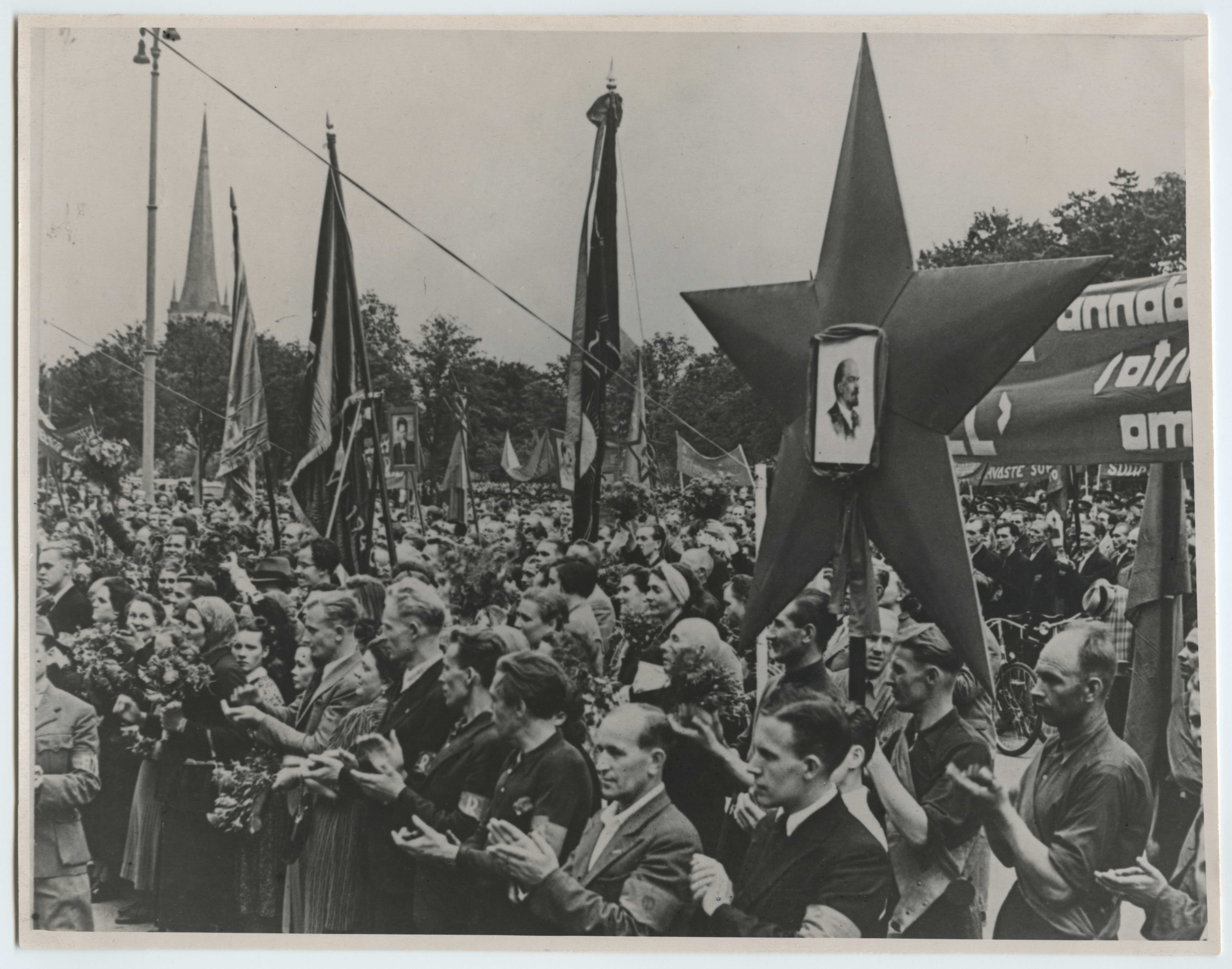 Vaade lippude ja loosungitega rahvahulgale; tagaplaanil Oleviste kiriku torn