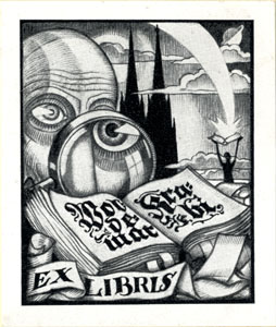 Esiplaanil vasakul luubiga avatud raamatut uuriv nägu, tagaplaanil maastik raamatut pea kohale tõstva inimsiluetiga. Joonises keskel avatud raamatus vasakul: Wol= / de= / mar paremal: Kra= / bi all vasakul lindil: EX LIBRIS