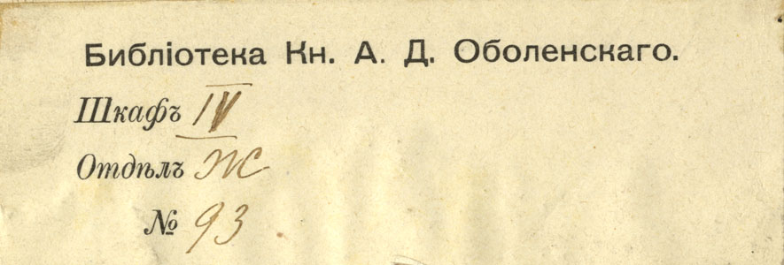 Lehel tekst: Библiотека Кн. А.Д. Оболенскаго. / Шкафъ / Отдѣлъ / №
