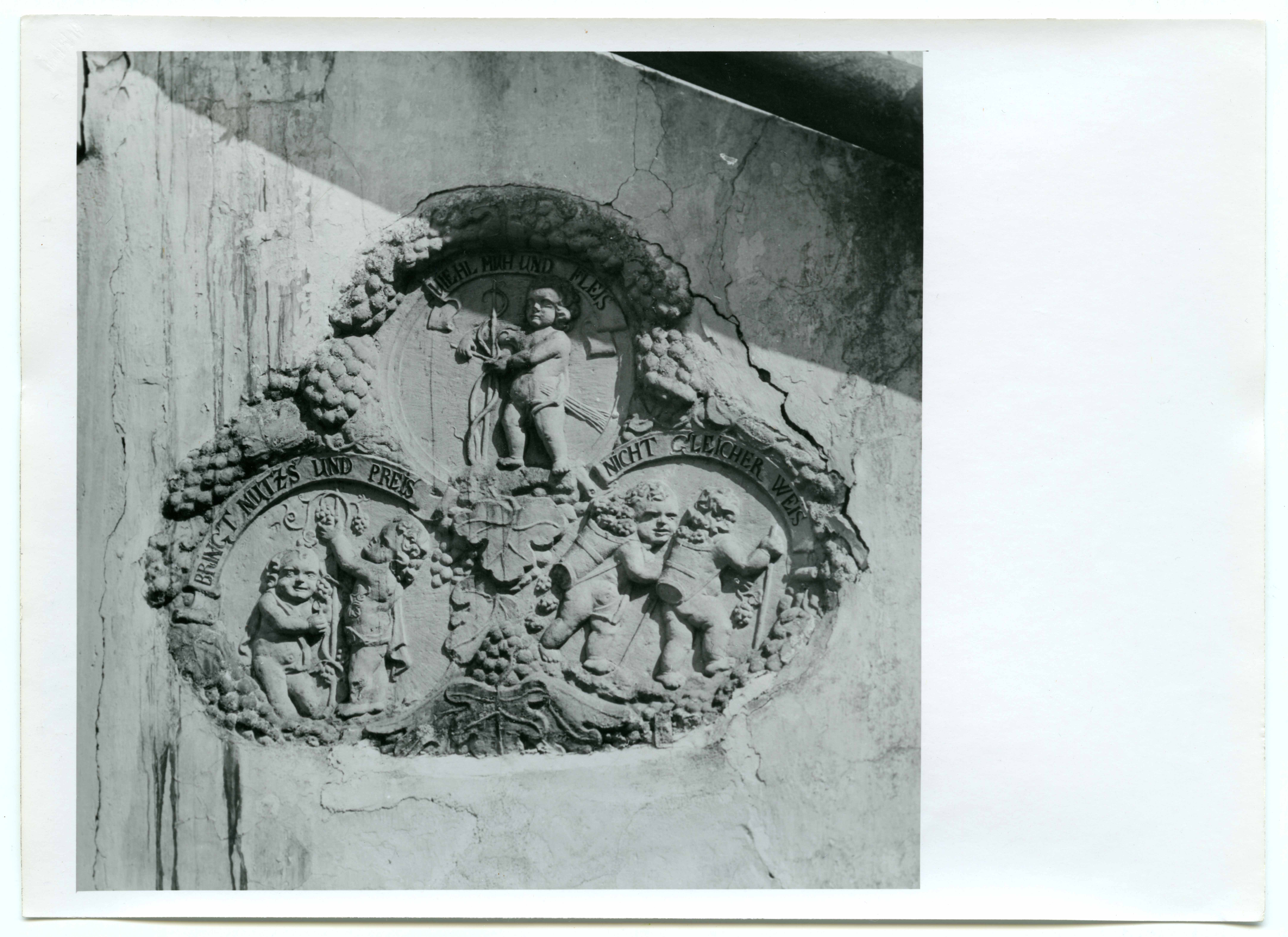 Narva. Suur tn 19, raidkivi hoovis (Matthias Daus, 1640.aa) kirjadega: "Viehl Muh und Fleis; bringt Nutzs und Preis; nicht gleicher weis"