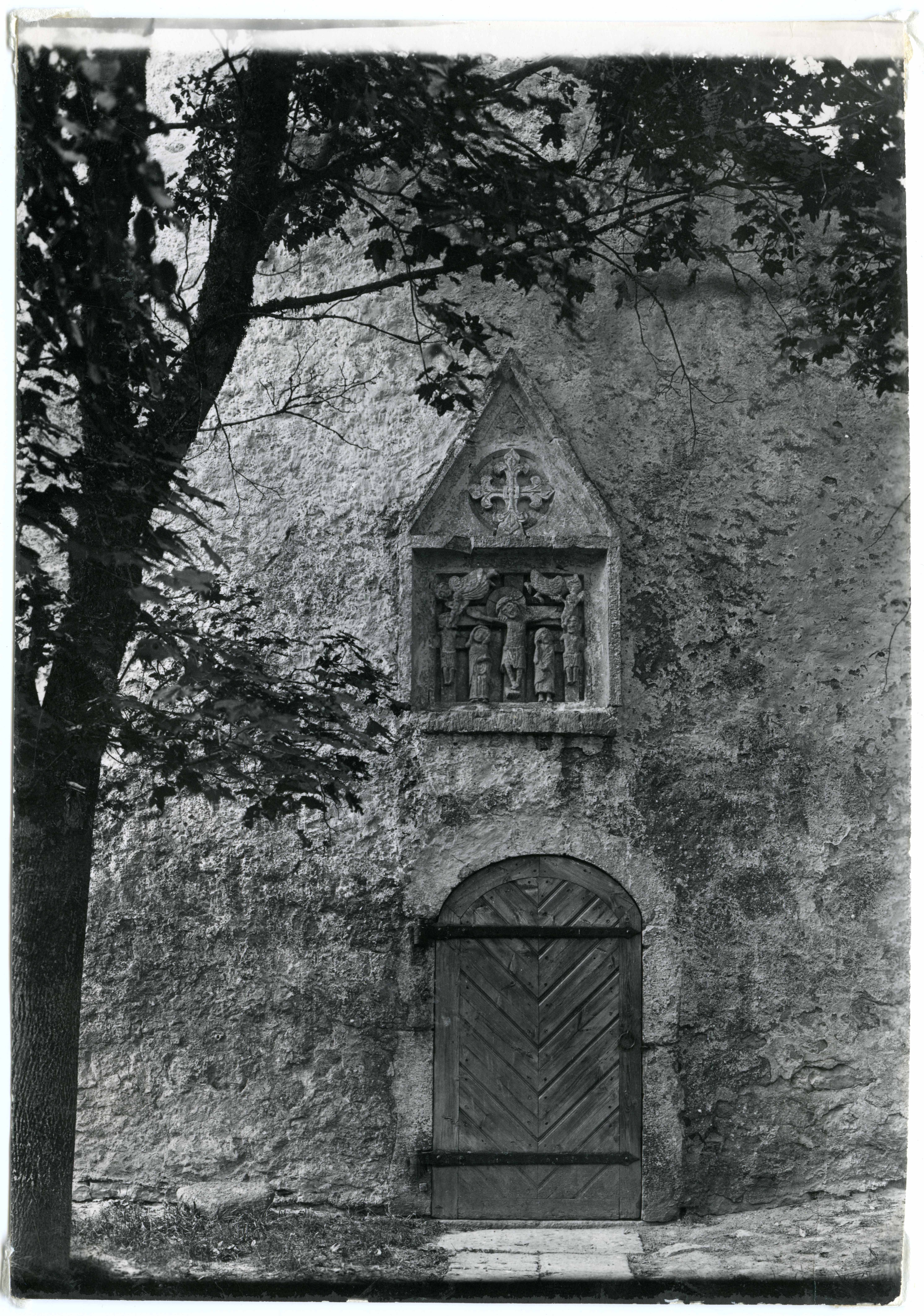 Karja Katariina ja Nikolause kirik. Endist S-portaali krooninud 4-nurkne reljeeftahvel S-eeskoja S-seinal. Kolgata kurbmäng